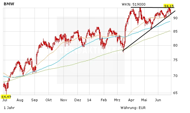 In den letzten Wochen arbeitete sich die Aktie von BMW wieder nach oben. Es scheint nur eine Frage der Zeit, wann BMW das alte Hoch bei 94,12 Euro nach oben knacken wird. Dann ist es auch nur eine Frage der Zeit, wann die Aktie die Marke von 100 Euro hinter sich lässt.