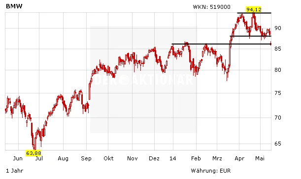 Nach dem Dividendenabschlag notiert die Aktie derzeit knapp oberhalb der 86-Euro-Marke. Der ehemals hartnäckige Widerstand fungiert inzwischen als massive Unterstützung. Der Autotitel scheint diese derzeit verteidigen zu können. Geht es wieder nach oben, warten die nächsten Hürden bei 88 Euro und beim Hoch bei 94 Euro.