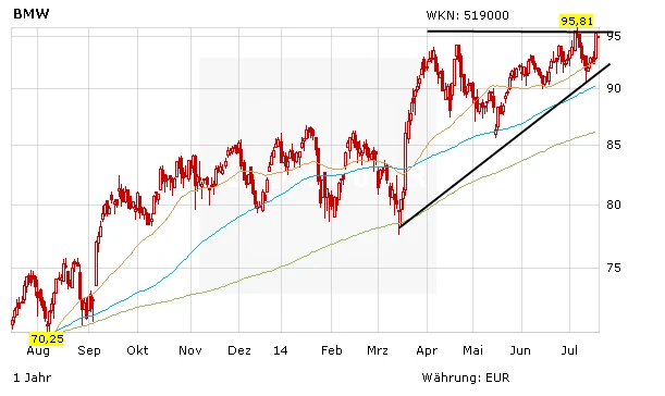Derartige Kurstreiber kann die BMW-Aktie derzeit gut gebrauchen. Zwar hinterlässt das Papier charttechnisch einen guten Eindruck, hat sich in den letzten Tagen wieder nach oben gearbeitet, dennoch, ähnlich wie bei Daimler gilt es jetzt endlich das alte Hoch nach oben zu überwinden. Bleibt zu hoffen, dass die Zahlen für das erste Halbjahr der Aktie den Ausbruch nach oben ebnen. Diese werden am 5. August veröffentlicht.