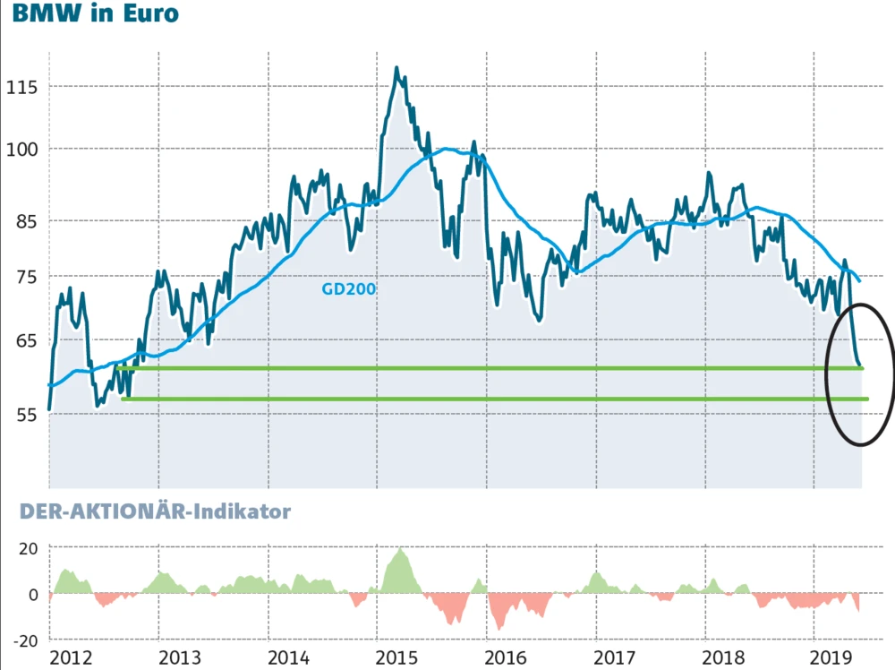 Die BMW-Aktie ist ein Spiegelbild der schlechten fundamentalen Entwicklung und natürlich auch des neuesten Zollstreits zwischen den USA und Mexiko. Das BMW-Papier ist aufgrund der Ankündigung neuer Zölle unter die wichtige Marke bei 63,40 Euro gefallen. Die nächste starke Unterstützung wartet erst im Bereich von 60,50 Euro. So niedrig notierte das Papier zuletzt im Jahr 2012. Entwarnung kann man bei BMW noch nicht geben. Anleger warten eine Bodenbildung ab.