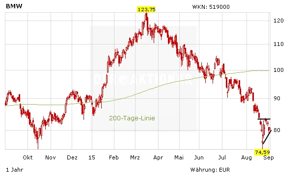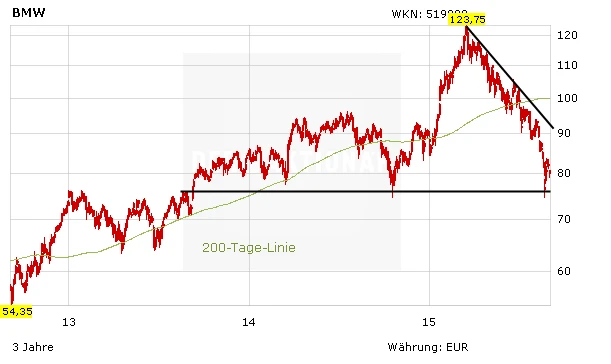 Beim Blick auf den Ein-Jahreschart wird deutlich: Die BMW-Aktie hat nach der Rallye zu Jahresbeginn den Rückwärtsgang eingelegt. Die 200-Tage wurde durchschnitten und liegt nun weit unter dem DAX-Titel. Sicherlich ein düsteres Chartbild, das Anleger eigentlich abschrecken sollte. Aber seit dem Jahrestief bei 74,59 Euro ist der generierte Aufwärtsimpuls weiter intakt. Wichtige wäre, dass die Aktie kurzfristig den Widerstand bei 83,73 Euro knackt um ein neues Hoch zu generieren. Mut macht auch der Drei-Jahres-Chart. Denn die horizontale Unterstützung bei 76,16 Euro hat zum zweiten Mal gehalten, da das Papier diese Marke nach dem Jahrestief wieder zurückerobert hatte.