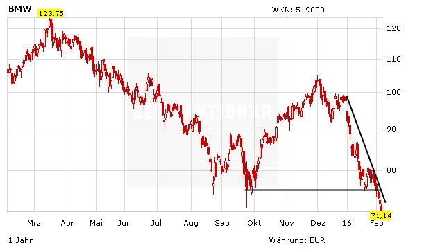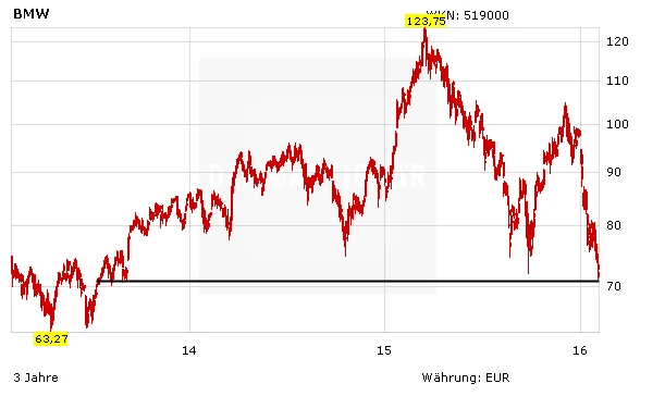 Da das in Ausgabe 03/16 empfohlene Kauflimit von 75,00 Euro bis Ende Januar nicht aufgegangen ist, befindet sich die BMW-Aktie nicht auf der Empfehlungsliste des AKTIONÄR. Gut möglich, dass das Papier in den nächsten Tagen einen Boden ausbildet. Doch für einen Einstieg ist es noch zu früh.