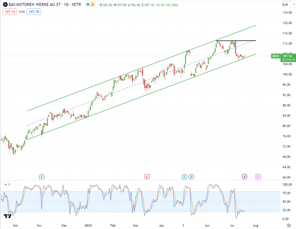 Zuvor hatte sich der Aktienkurs an der Horizontale bei 112,98 Euro die Zähne ausgebissen. Sowohl im Juni als auch im Juli konnten die Bären die Aktie nach unten drücken.