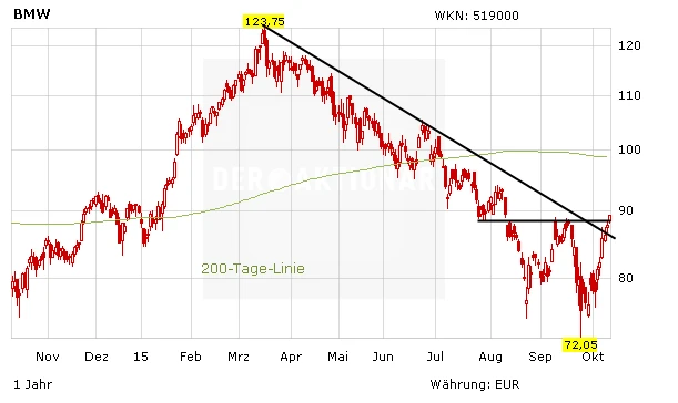 DER AKTIONÄR bevorzugt im Automobil-Sektor weiter die Daimler-Aktie. Trader können allerdings nach dem Sprung über den Widerstand bei 88,35 Euro und dem Bruch des Abwärtstrends bei BMW eine Position wagen.