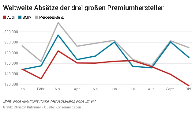 Auf das Jahr gerechnet liegt BMW somit bei 1,74 Millionen verkauften Pkws. Konkurrent Daimler konnte in den vergangenen zehn Monaten den Vorsprung auf 1,91 Millionen Fahrzeugen ausbauen. Großer Verlierer unter den Premiumherstellern ist die VW-Tochter Audi, welche seit Jahresanfang bei den Absatzzahlen fast immer hinter den beiden Konkurrenten lag.
