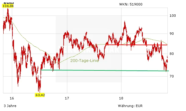 Charttechnisch hat sich die Situation etwas aufgehellt. Wie aus dem Lehrbuch prallte die BMW-Aktie vergangene Woche am wichtigen Widerstand im Bereich 72,70 Euro ab und läuft seitdem wieder gen Norden. Auch heute geht es rund 1,3 Prozent nach oben auf 77,90 Euro. Trotzdem rät DER AKTIONÄR zur Vorsicht. Die technischen Gegenbewegungen wurden in diesem Jahr bereits mehrmals abverkauft.