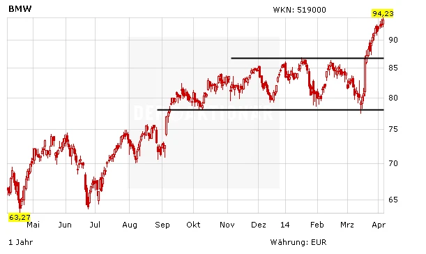 Nach guten Meldungen ist die Aktie von BMW zuletzt enorm gut gelaufen. Mitte März gelang der chattechnische Ausbruch aus einem Seitwärtstrend nach oben, am Freitag vergangener Woche erreichte der Wert sogar bei 94,23 Euro ein neues Allzeithoch. Kurzzeitig ist die Aktie sicher etwas heiß gelaufen, langfristig gehört die BMW-Aktie aber weiterhin zu den Top-Werten. Es dürfte nur eine Frage der Zeit sein, bis das AKTIONÄRs-Kursziel von 110 Euro erreicht wird. Anleger bleiben deswegen mit einem Stopp bei 77,50 Euro weiter investiert.