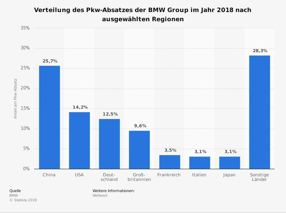Doch nicht nur für BMW ist China der wichtigste Automarkt der Welt. Die Experten des CAR-Instituts gehen davon aus, dass im Jahr 2019 22,3 Millionen neue Autos verkauft werden. Zum Vergleich: Deutschland wird auf 3,3 Millionen neu verkaufte Fahrzeuge kommen. Im Jahr 2018 ist der chinesische Automarkt das erste Mal seit 20 Jahren geschrumpft. Zwischenzeitlich erhobene Sonderzölle auf Autos aus den USA haben die Fahrzeuge verteuert und so die Nachfrage gedämpft.