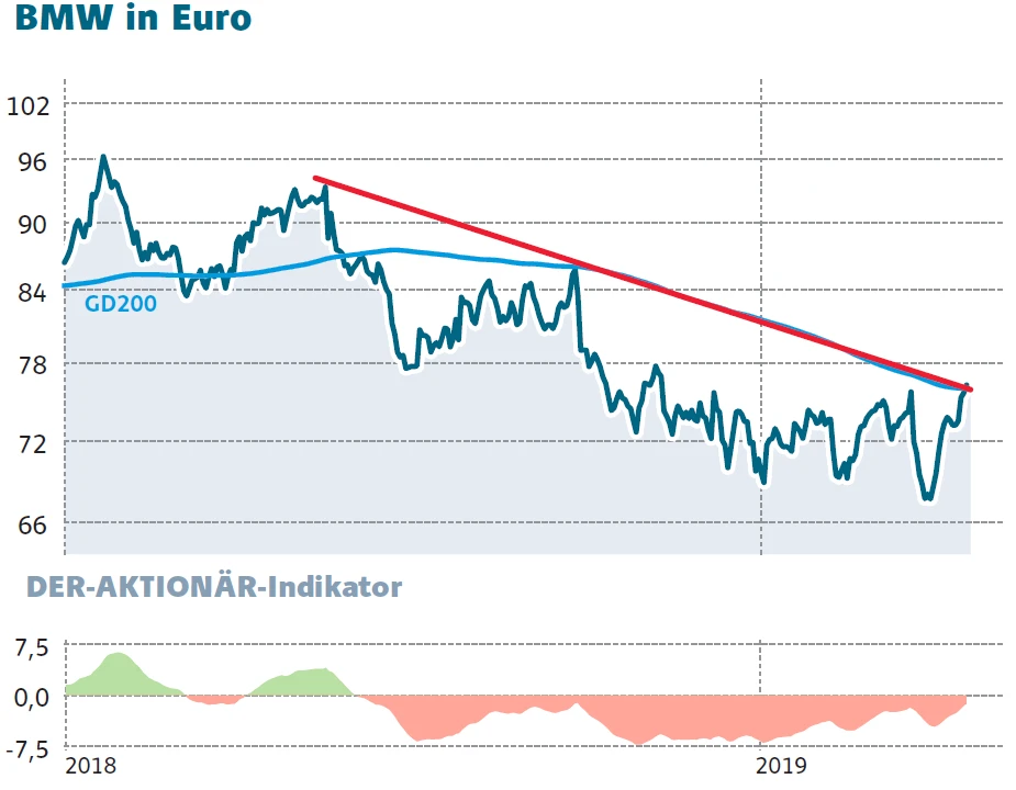 In einer unübersichtlichen Nachrichtenlage zeigte die BMW-Aktie zuletzt keinen klaren Trend. Die Warnung vor einem holprigen Geschäftsjahr und eine drohende Milliardenstrafe verunsicherte die Anleger. Dennoch hat die Aktie ein Kaufsignal geliefert. Die 200-Tage-Linie und der Abwärtstrend wurden durchbrochen. Nun ist der Weg frei bis zum nächsten Widerstand bei 80 Euro. Nächster Halt: 85 Euro.