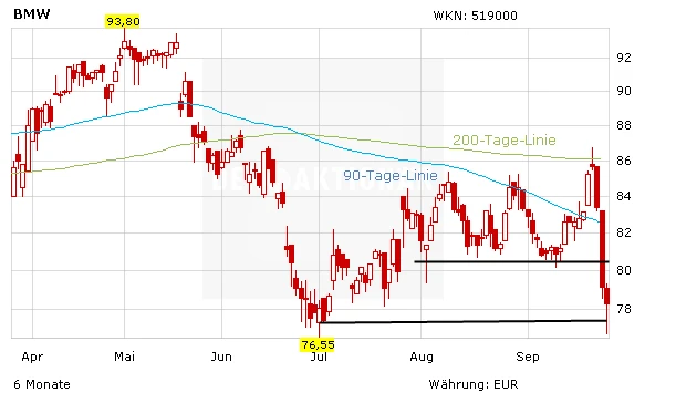 Das Papier des DAX-Konzerns notierte noch am 21. September 2018 bei einem Zwischenhoch von 85,77 Euro. Im Anschluss wurde die wichtige Unterstützungsmarke vom 11. September bei 80,76 Euro durchbrochen. Aktuell notiert die Aktie bei 78,40 Euro. Für den AKTIONÄR ist die BMW-Aktie weiterhin kein Kauf.