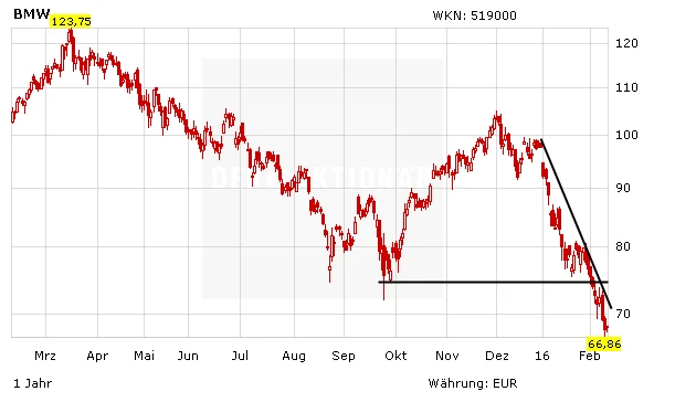 Auch wenn die BMW-Aktie auf dem aktuellen Kursniveau mit einem 2016er-KGV von 8 und einer Dividendenrendite von über vier Prozent sehr attraktiv für einen Einstieg wirkt, sollten sich Anleger in Geduld üben. Denn die charttechnische Verfassung des Papieres ist weiter äußerst angespannt. Gut möglich, dass auch einige Analysten noch ihr Kursziel senken, was den DAX-Titel belasten dürfte. Die Experten der UBS korrigierten den fairen Wert der Aktie heute bereits von 82 auf 69 Euro.