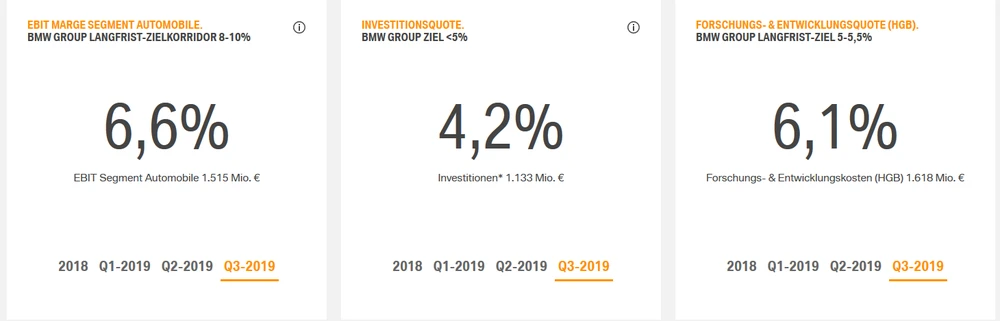 Die viel beachtete operative Marge im Kerngeschäft Automobilbau stieg um 2,2 Prozentpunkte auf 6,6 Prozent. Im Vorjahr hatten die Einführung des Abgas- und Verbrauchstests WLTP sowie hohe Gewährleistungsrückstellungen belastet. Zudem profitierte BMW von dem gestiegenen Anteil an teuren Stadtgeländewagen (SUVs). Zwischen Juli und September wuchs der Konzernumsatz im Jahresvergleich um 7,9 Prozent auf 26,7 Milliarden Euro, unter dem Strich standen mit 1,55 Milliarden Euro 11,5 Prozent mehr Gewinn. Die Prognose bestätigte das Management.