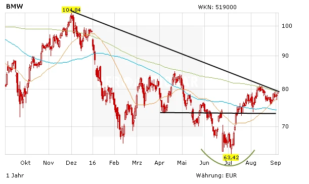 Trotz der eher schwachen Zahlen im wichtigen Absatzmarkt USA sendet die BMW-Aktie wieder Lebenszeichen. Bei rund 63 Euro hat das Papier einen Doppelboden ausgebildet. Seitdem geht es mit der Aktie wieder aufwärts. Bei knapp 80 Euro ist BMW an der 200-Tage-Linie gescheitert. Nach einer kurzen Konsolidierung sollte der nächste Angriff erfolgen. Grundvoraussetzung dafür ist ein freundlicher Gesamtmarkt. Wird die 200-Tage-Linie erfolgreich überwunden, ergibt sich ein neues Kaufsignal. Wer investiert ist, bleibt dabei.