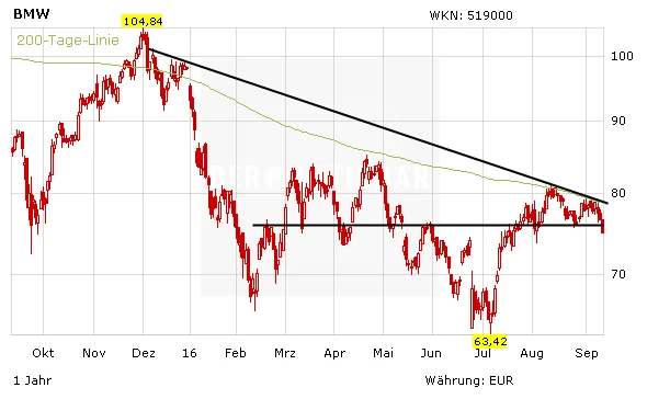 Am Dienstag hat der Autobauer BMW seine Absatzzahlen für August präsentiert. Im freundlichen Marktumfeld haben diese dem DAX-Titel keinen neuen Schwung verliehen. Nach wie vor pendelt die Aktie im Seitwärtskorridor zwischen 75 und 80 Euro. Die 200-Tage-Linie bei 77,60 Euro ist vorerst das nächste Ziel.