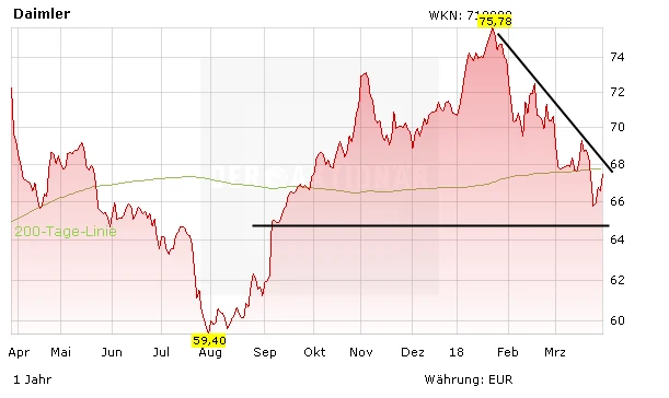Die Aktie von Daimler bewegt sich seit Januar ebenfalls eher Abwärts – befindet sich aber immer noch über der wichtigen 65,00 Euro-Marke.