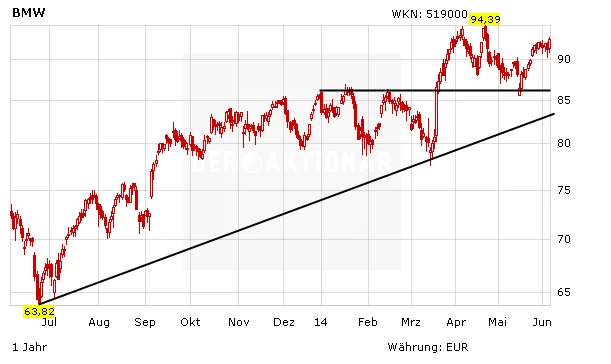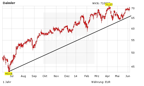 Die beiden deutschen Autobauer schwimmen damit weiter auf der Erfolgswelle. Die gesamte Branche sollte in den kommenden Monaten weiter von der starken Nachfrage nach Autos im Premium-Bereich profitieren. Investierte Anleger bleiben dabei und setzten einen Stopp für BMW bei 77,50 Euro und für Daimler bei 57,00 Euro. Vor allem bei Daimler bieten sich schwache Tage nach wie vor als Kaufchancen an.
