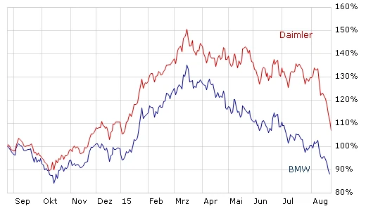 Zu Wochenbeginn steht für die beiden deutschen Autobauer BMW und Daimler jeweils ein Minus von über drei Prozent zu Buche. Lässt sich für Anleger aus dieser Tatsache schließen, dass sich beide Werte proportional zueinander entwickeln?