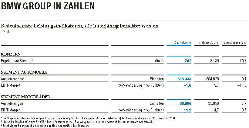 Vor einem Jahr hatte BMW im ersten Quartal noch einen Gewinn in Höhe von 1,88 Milliarden Euro eingefahren. 2019 musste BMW für ein EU-Kartellverfahren wegen verbotener Absprachen in Sachen Abgasnachbereitung 1,4 Milliarden Euro zurückstellen. Das verhagelte den Jahresauftakt und sorgte dafür, dass im Kerngeschäft in den ersten Monaten des laufenden Jahres ein Verlust vor Zinsen und Steuern von 310 Millionen Euro anfiel. Nur mit den Gewinnen aus dem Leasing- und Kreditgeschäft und der Motorradsparte schaffte BMW noch einen Überschuss von 588 Millionen Euro.