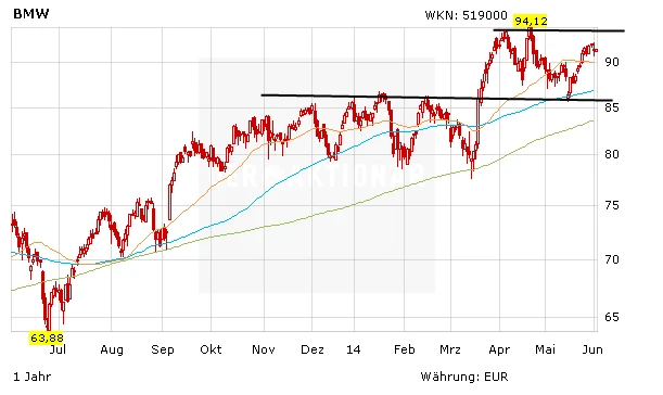 Blickt man auf die Aktie, so notiert das Papier seit mehreren Wochen in einer Seitwärtsrange. Den letzten Schub bekam das Papier, als Konzernchef Reithofer von knapp zwei Monaten ehrgeizige Ziele für das Gesamtjahr ausrief. "Wir steuern im laufenden Jahr einen deutlichen Absatzzuwachs und damit eine neue Bestmarke von über zwei Millionen Fahrzeugen an", so der BMW-Chef.