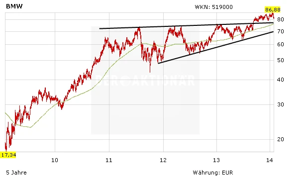 Die BMW-Aktie kann sich der Schwäche am Gesamtmarkt jedoch nicht widersetzen. Vom Hoch bei 86,88 Euro hat der Wert rund 6,5 Prozent nachgegeben. Im großen Chartbild wäre selbst ein Rücksetzer bis 75 Euro kein Problem. Das wäre noch als Rebound auf das alte Ausbruchsniveau zu sehen. In diesem Bereich verläuft auch die 200-Tage-Linie, was den Kurs zusätzlich stabilisieren sollte. Die Kursschwäche ist eine willkommene Gelegenheit, beim Münchener Premium-Autohersteller noch einmal günstig zum Zug zu kommen. Die Dividendenrendite bei den Stammaktien liegt aktuell bei 3,1 Prozent. Ein Stopp für Neueinsteiger bietet sich bei rund 70 Euro an.