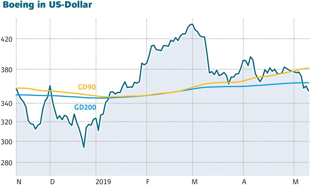 Es geht abwärts für den US-Luftfahrtkonzern: Während nach den Flugzeugabstürzen die Öffentlichkeit weiter vor einer Blackbox steht, ist der Kurs der Boeing-Aktie unter eine wichtige Linie abgerutscht. Ein Blick auf den Chart zeigt, dass das Risiko für noch tiefere Notierungen beträchtlich ist. Besserung, zum Beispiel durch positive Nachrichten, ist nicht absehbar.