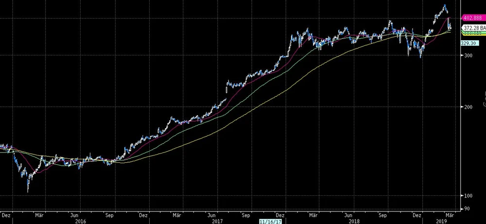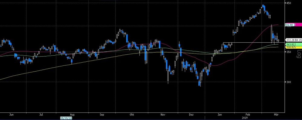 Beim Blick auf den langfristigen Chart fällt auf, dass es trotz der verheerenden Abstürze und des voraussichtlich hohen finanziellen Schadens, der auf Boeing zukommt, noch relativ gut aussieht. Die jüngste Korrekturbewegung um etwa 20 Prozent nach einem Kursanstieg von fast 200 Prozent in den beiden vorangegangenen Jahren wäre rein charttechnisch betrachtet sogar als durchaus gesund zu werten.