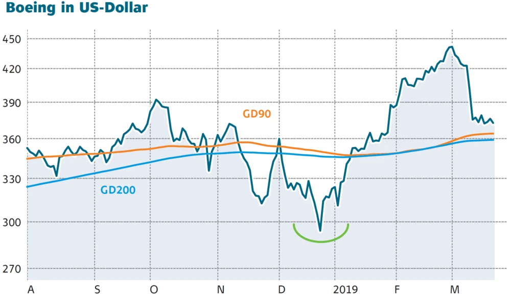 Das Drama um Boeing geht weiter, investierte Anleger halten trotzdem an den Papieren fest, ein Stopp zur Absicherung der zuvor angelaufenen Kursgewinne sollte bei 270,00 Euro platziert werden. Wer sich im Sektor engagieren will, sollte eher auf den großen Boeing-Rivalen Airbus setzen.