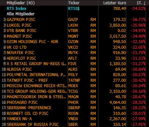 Der Kriegsbeginn in der Ukraine trifft die Moskauer Börse mit voller Wucht. Der RTS-Index verliert am Donnerstag zu Handelsbeginn mehr als 30 Prozent. Seit Jahresbeginn hat sich der Leitindex damit bereits mehr als halbiert. Auf breiter Front geben die russischen Blue Chips wie Gazprom, Lukoil oder Sberbank ein Viertel bis ein Drittel ihres Wertes ab.