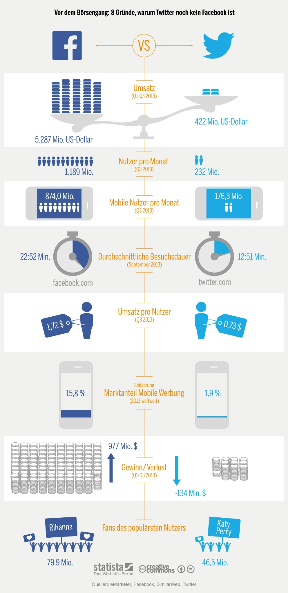 Fakt ist: Facebook ist bereits seit Jahren profitabel, während Twitter wohl frühestens in der zweiten Jahreshälfte 2014 der Sprung in die schwarzen Zahlen gelingt. Andererseits wächst Twitter beim Umsatz stärker als das Soziale Netzwerk.