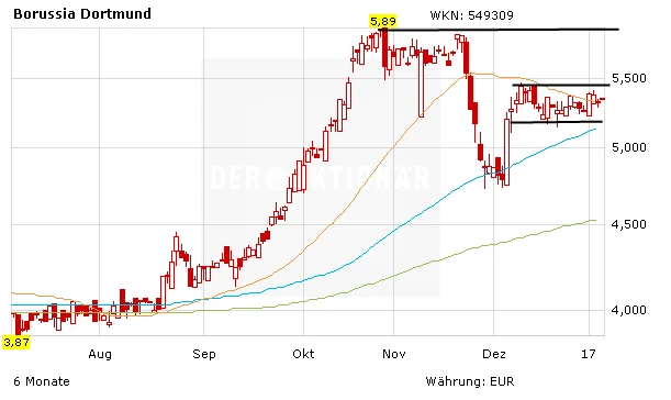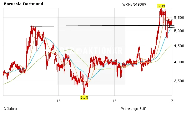 Es bleibt dabei: Die Mannschaft des BVB ist gespickt mit jungen Talenten, deren Marktwerte über erhebliches Potenzial verfügen. Das Interesse von europäischen Top-Clubs für Aubameyang, Weigl oder Dembélé ist geweckt. Die BVB-Aktie ist zwischen 5,20 Euro und 5,40 Euro ein Kauf.