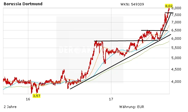 Die Aktie von Borussia Dortmund hat in den letzten Tagen weiter zugelegt und zwischenzeitlich die Marke von 8,00 Euro erreicht. Grund für den Höhenflug ist nicht nur der sportliche Erfolg des BVB in der Bundesliga. Der Dembélé-Deal mit dem FC Barcelona sowie die Transfers von Neymar sowie Mbappe und die dabei aufgerufenen Transfersummen haben zur Folge, dass der Kader des BVB neu bewertet werden muss. Insofern ist der Aufwärtstrend der Aktie mehr als gerechtfertigt. Die Marke von 8,00 Euro sollte nach Ansicht von DER AKTIONÄR auch nur eine Zwischenstation darstellen.