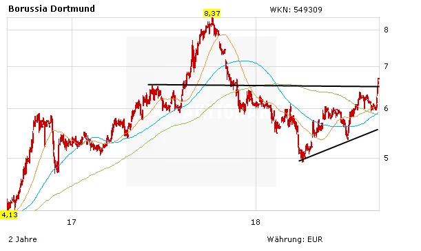Möglich ist für den BVB eine schwere Gruppe mit Real Madrid, Vorjahresfinalist Liverpool sowie Inter Mailand. Dann müssen Anleger aufmerksam sein. So könnte es durchaus sein, dass die Aktie einige Punkte ihrer guten Performance der letzten Tage wieder abgibt. Kurse um 6,40 Euro sind Kaufkurse!