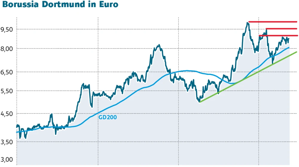 Nach einer Konsolidierung zwischen 8,40 Euro und 8,60 Euro hat die BVB-Aktie wieder den Weg nach oben eingeschlagen. Die nächste Hürde wartet auf das Papier im Bereich von 9,01 Euro. Wird auf diese Marke genommen, so hat die BVB-Aktie Luft bis zur Marke von 9,47 Euro!