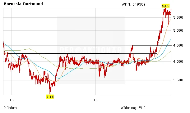 Die guten Zahlen werden der Aktie helfen, den Aufwärtstrend fortzusetzen. Jede Runde in der Champions League, jedes gute Spiel in der Bundesliga und damit eine Verbesserung in der Tabelle steigert den Marktwert der jungen BVB-Profis. Gut möglich ist darüber hinaus, dass der BVB in den nächsten Monaten einen neuen Deal mit einem großen Sportausrüster an Land zieht. Die Summen, die derzeit bezahlt werden, sprengen jeden Rahmen und ohnehin die aktuelle Bewertung des BVB an der Börse mit 524 Millionen Euro. Das Kursziel wurde von DER AKTIONÄR vor einigen Wochen von 6,00 Euro auf 7,50 Euro erhöht. Anleger geben kein Stück aus der Hand.
