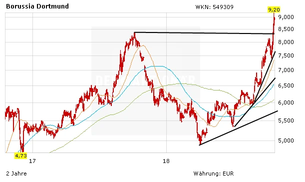 Die Aktie von Borussia Dortmund legte am Donnerstag in einem schwachen Marktumfeld weiter zu. Seitdem das Papier das Hoch aus dem Monat Oktober 2017 bei 8,27 Euro genommen hat, kletterte die Aktie um weitere 10,5 Prozent.