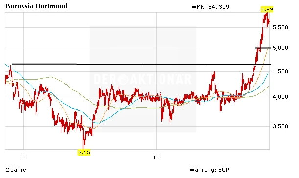 Die Aktie ist in den letzten Wochen bis auf 5,88 Euro nach oben geschossen. Eine Konsolidierung war überfällig. Diese läuft derzeit und ließ das Papier bis auf 5,62 Euro fallen. Grundsätzlich sieht DER AKTIONÄR die Aufwärtsbewegung der Aktie noch nicht am Ende. Der BVB ist an der Börse mit 525 Millionen Euro bewertet. Alleine der Wert des BVB-Kaders beträgt 352 Millionen Euro. Gut möglich, dass auch der BVB in den nächsten Monaten einen neuen Deal mit einem großen Sportausrüster an Land zieht. Die Summen, die derzeit bezahlt werden, sprengen jeden Rahmen und die aktuelle Bewertung des BVB. Das Kursziel wurde von DER AKTIONÄR vor wenigen Tagen auf 7,50 Euro erhöht.