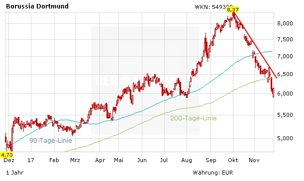 Zwar steigt das Papier am Montag um 2,9 Prozent auf 6,20 Euro; dies kann jedoch nicht über die massiven Verluste der jüngsten Zeit hinwegtäuschen. Das Papier von Deutschlands einzigem börsennotiertem Fußballverein verlor allein in der letzten Woche rund neun Prozent an Wert und fiel bis zum Freitag auf 6,06 Euro.
