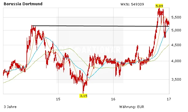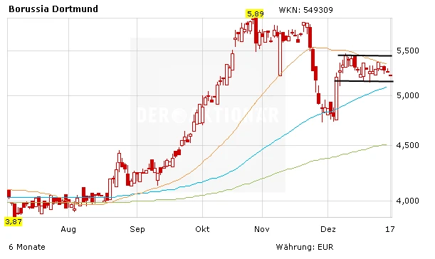 Die BVB-Aktie pendelt derzeit zwischen 5,40 Euro und 5,20 Euro. Auf diesem Niveau lohnt es sich nach wie vor, eine Position als Depotbeimischung aufzubauen. Freilich liegen sportlicher Erfolg und eine gute Kursentwicklung eng beieinander. Dennoch: die Aktie ist nicht nur für BVB-Fans eine Spekulation wert. Kursziel 7,50 Euro