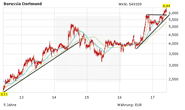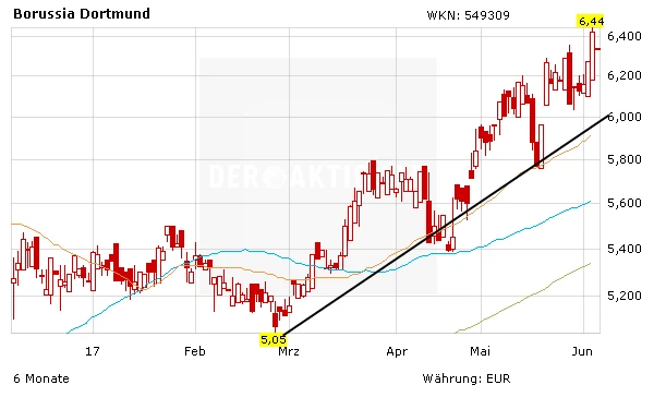 Die BVB-Aktie klettert weiter nach oben. Die nächste Hürde liegt bei 6,85 Euro. Dann ist das Kursziel von DER AKTIONÄR mit 7,50 Euro auch nicht mehr weit entfernt. Der BVB ist drauf und dran, wieder einige hochtalentierte Kicker nach Dortmund zu holen. Es bleibt dabei: Die Aktie spiegelt den Marktwert der jungen Kicker noch immer in keinster Weise wider. Auch in der kommenden Saison können sich die Spieler wieder auf Europa größter Fußballbühne präsentieren, was die Marktwerte sicherlich weiter steigen lässt. Anleger geben kein Stück aus der Hand.