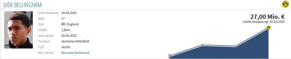 Bellingham wird aktuell mit 27 Millionen Euro geführt, Reyna nur mit 15 Millionen Euro.