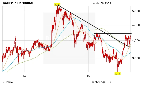 Die Phantasie der Aktie besteht einerseits darin, dass sich viele junge Spieler wie etwa Julian Weigl weiterentwickeln und den Marktwert steigern. Oder auch Stürmer Aubameyang, aktuell mit 18 Millionen Euro bewertet, wird bald nicht mehr unter 25 oder 30 Millionen Euro zu haben sein. So wird sich der Wert des kompletten Kaders weiter nach oben entwickeln. Laut transfermarkt.de hat dieser aktuell einen Wert von knapp 302 Millionen Euro. „Schon allein dieser deckt derzeit fast die komplette Börsenbewertung ab. Die Marke Borussia Dortmund gibt es quasi umsonst dazu“, sagt Analyst Christoph Schlienkamp vom Bankhaus Lampe. Auf der anderen Seite sieht es ganz nach einer sehr guten Saison für den BVB aus. Sollten sich die Schwarz-gelben für die Champions League in der kommenden Saison qualifizieren, wird die Aktie bereits weiter über 5,00 Euro notieren! Der Hot-Stock aus DER AKTIONÄR 36/2015 ist weiterhin ein Kauf.