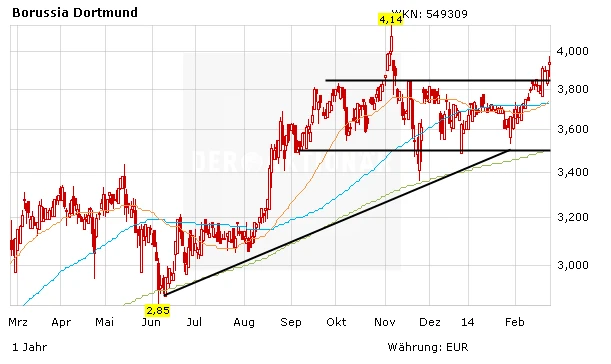 Die Dortmunder haben die Tür für den Einzug in das Viertelfinale der Champions League weit aufgestoßen. Eine weitere Steilvorlage für die BVB-Aktie. Davon gab es zuletzt gleich mehrere. Der US-Finanzinvestor KKR hat sich mit 9,7 Prozent an Hertha BSC Berlin beteiligt und dafür 61,2 Millionen Euro bezahlt. Damit bewertet KKR die Hertha mit rund 220 Millionen Euro. Hinzu kommt ein super Deal des FC Bayern München mit der Allianz. Die hat sich bei den Bayern mit 8,33 Prozent eingekauft. Der Versicherungsriese bewertet den FC Bayern dadurch mit rund 1,3 Milliarden Euro. BVB-Geschäftsführer Hans-Joachim Watzke schmeckt die Situation und die niedrige Bewertung des BVB gegenüber der Konkurrenz ganz und gar nicht. "Wir haben ein eigenes Stadion, auf dem mit rund 30 Millionen Euro unsere einzigen verbliebenen Verbindlichkeiten liegen. Das Stadion ist über 200 Millionen Euro wert. Wir haben einen Spielerwert von über 300 Millionen. Das sind schon 500 Millionen - von den anderen Dingen gar nicht zu reden", sagte Watzke in einem Interview mit der Frankfurter Allgemeinen Zeitung.