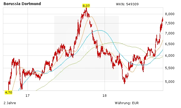 Durch einen 4:2 Auswärtssieg hat Borussia Dortmund die Tabellenführung in der Fußball-Bundesliga erobert. Die Aktie konsolidiert derzeit auf hohem Niveau. Der nächste Schub sollte das Papier bis zum alten Hoch bei 8,34 Euro führen.