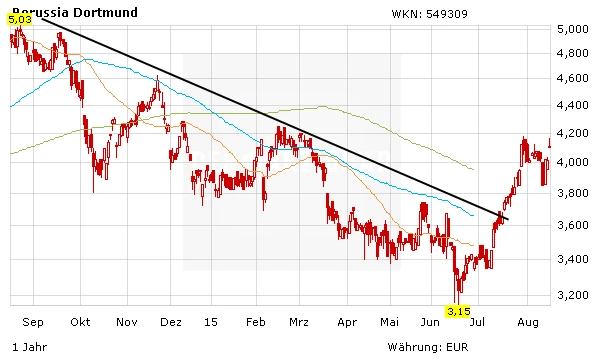 Dennoch: In der Bundesliga bleibt es weiterhin extremt spannend. Es sieht sogar ganz danach aus, als könne der BVB wieder zum Bayern-Jäger werden. In dieser Verfassung und mit Taktik-Fuchs Thomas Tuchel sollte der BVB in der laufenden Saison auf jeden  Fall den Sprung unter die Top 4 Teams der Bundesliga schaffen. Die Aktie indes hat in den letzten Wochen schon einiges vorweg genommen. Von 3,35 Euro ging es bis auf 4,10 Euro nach oben. Die Aktie hat weiteres Potenzial. Kaufen. Kursziel 5,00 Euro.
