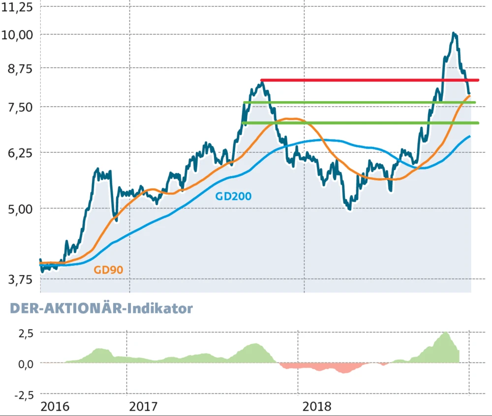 Mutige Anleger können bei der BVB-Aktie weiter an Bord bleiben. Das Papier hat die überkaufte Marktlage nach dem starken Aufwärtsmove von 6,60 Euro bis auf 10,30 Euro abgebaut. Nur der extrem schwache Gesamtmarkt machte die mustergültige Konsolidierung bis auf die Ausbruchslinie bei 8,30 Euro zunichte. Die nächste Unterstützung liefert dei 90-Tage-Linie bei 7,82 Euro. Anleger können versuchen, Abstauberlimits bei 7,65 Euro und 7,36 Euro zu setzen.