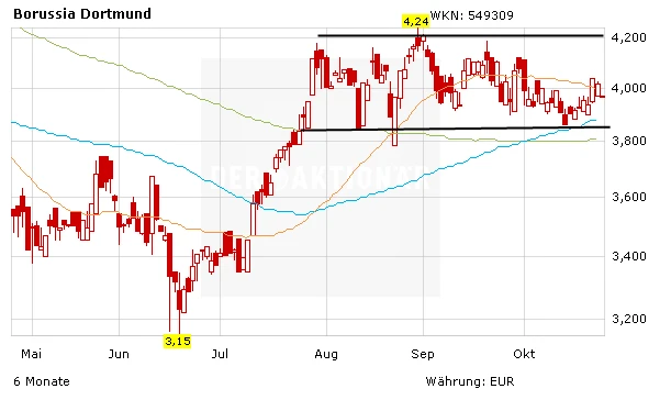 Zugegeben, das Papier braucht einen neuen Katalysator. Sei es ein neuer Sponsoren-Deal oder ein neuer Ankeraktionär. Es bleibt dabei: DER AKTIONÄR ist überzeugt, dass die Borussia gute Chancen hat, sich in der laufenden Saison wieder direkt für die Champions League zu qualifizieren. Auch der aktuelle Kader wird bei derartigen Leistungen an Marktwert deutlich zulegen. Damit sind nicht nur junge Talente wie Julian Weigl gemeint. Auch Torjäger Pierre-Emerick Aubameyang wird an Marktwert deutlich zulegen! Die BVB-Aktie ist nach wie vor unterbewertet. Das Papier bleibt ein Kauf!