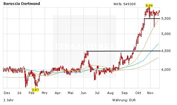 Am Montag hatte der BVB für das erste Quartal glänzende Zahlen vorgelegt. Die aktuelle Bewertung des BVB an der Börse beträgt derzeit 524 Millionen Euro. DER AKTIONÄR ist nach wie vor davon überzeugt, dass dies nicht dem tatsächlichen Wert des Klubs entspricht. Die Marktwerte der vielen jungen Spieler werden sich in den kommenden Monaten weiter nach oben bewegen. Der Kader des BVB ist gespickt mit hochtaltentierten Kickern.
