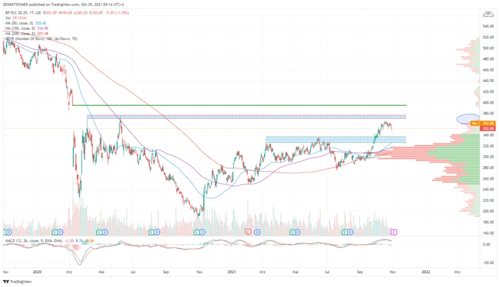 Im Fokus stehen nun die Q3-Zahlen, die am Dienstag (2. November) veröffentlicht werden. Sollte BP mit diesen enttäuschen, wäre mit einem Test der Unterstützungszone zwischen 327 und 337 Pence zu rechnen. Bei Kursen darunter dürfte die 200-Tage-Linie bei 307,48 Pence wieder anvisiert werden.