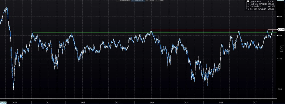 Durch den Anstieg über die Hürde bei 529 Britischen Pence liegt vorerst kein ernstzunehmender Widerstand mehr vor – bis zur Marke von 658,20 Pence. Markiert wurde dieser Kurs am 21. April 2010, dem Tag nach der Explosion der Deepwater Horizon.