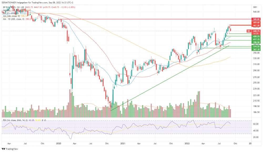 Die aktuelle Situation mit einer anhaltend hohen Nachfrage sowie die weiter steigenden Öl- und Gaspreise spielen großen Öl-Konzernen wie BP natürlich voll in die Karten. Die Aktie läuft wie geschmiert und notiert so hoch wie zuletzt zum Jahreswechsel 2019 auf 2020. Für investierte Anleger und auch Neueinsteiger sind jetzt diese Marken von hoher Bedeutung.